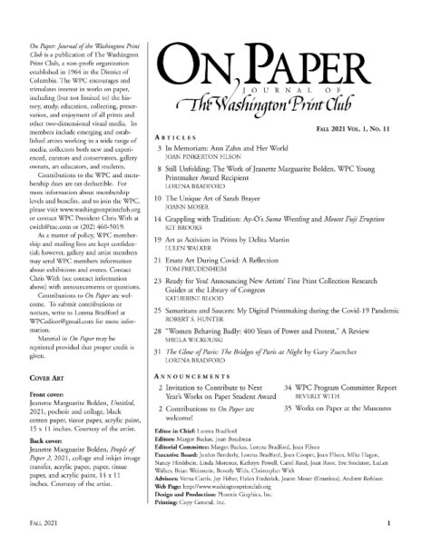 Front cover: Jeanette Marguarite Bolden, Untitled, 2021, pochoir and collage, black cotton paper, tissue paper, acrylic paint, 15 x 11 inches. Courtesy of the artist.Table of ContentsBack cover: Jeanette Marguarite Bolden, People of Paper 2, 2021, collage and inkjet image transfer, acrylic paper, paper, tissue paper, and acrylic paint, 14 x 11 inches. Courtesy of the artist.