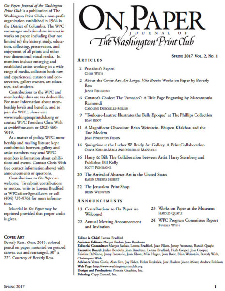 On Paper, Spring 2017, Volume 2, No. 1 Front cover On Paper, Spring 2017: Beverly Ress, Grass, 2011, colored pencil on paper, mounted on gessoed canvas, cut and rearranged, 30″ x 22″. Courtesy of Bevery Ress.